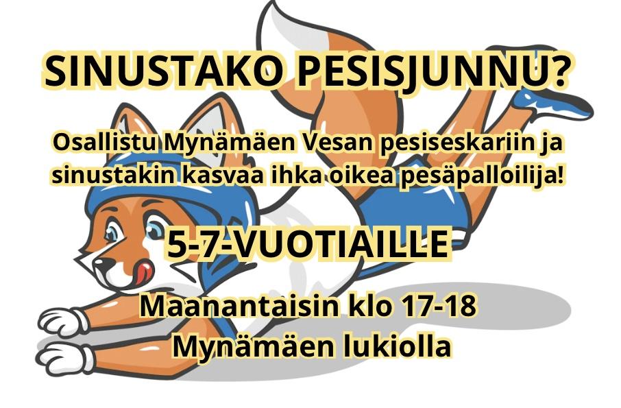 Pesiseskari on Mynämäen Vesan uutuustunti, joka on saanut inspiraationsa jo pari kautta järjestetystä Kunnariketun pesisliikkarista. Pesiseskari on 5-7 -vuotiaille lapsille suunnattu tunnin mittainen pesistuokio, joka pidetään kerran viikossa maanantaisin klo 17-18 Mynämäen lukiolla. Pesiseskarin talvikauden hinta on 40€, sisältäen pesispassin ja vakuutuksen. Pesiseskarin talvikausi kestää marraskuusta aina maaliskuun loppuun asti, joululomalla pidetään muutaman viikon tauko!